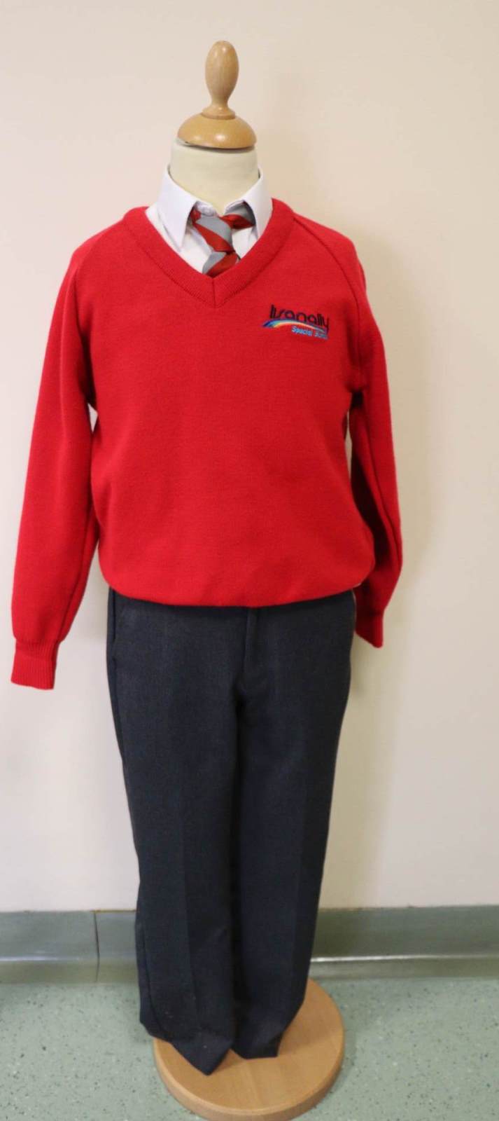 Boys: Red V-neck jumper with logo, white shirt (no logo), red /silver tie (no logo) and grey trousers (no logo).