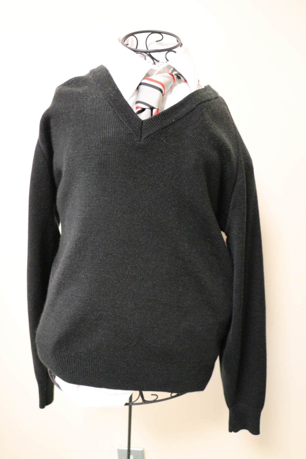 Boys: Black V-neck jumper (no logo), white shirt (no logo), black/red/silver tie (no logo) and black trousers (no logo).