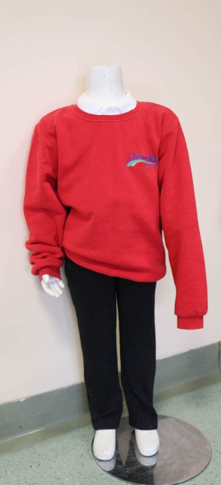 Girls / Boys: Red sweatshirt with logo, white polo shirt with logo, black jogging bottoms (no logo).